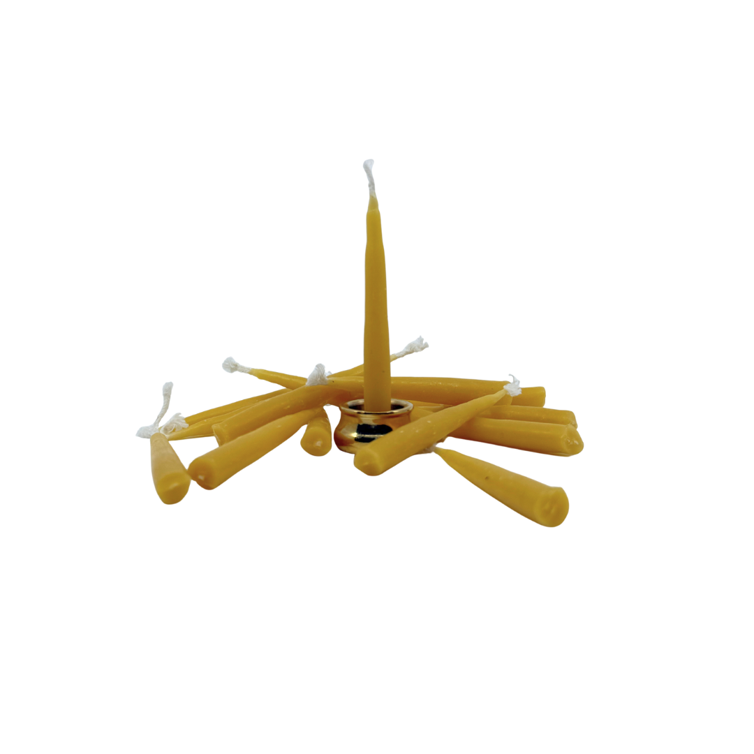 The set features 15 hand-poured, 100% natural beeswax candles accompanied by a mini brass holder. All our candles are ethically sourced.