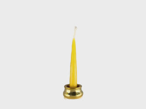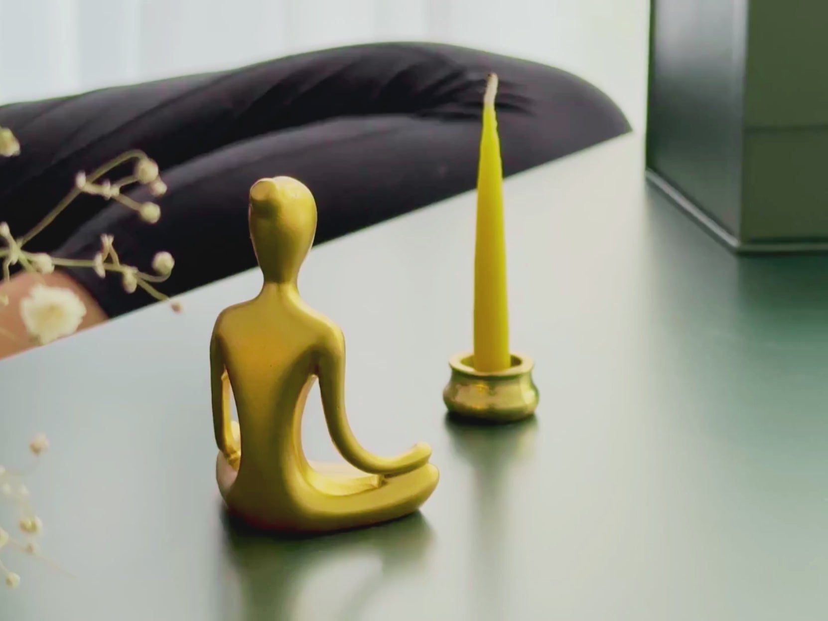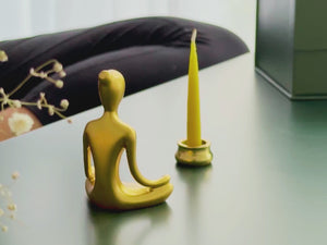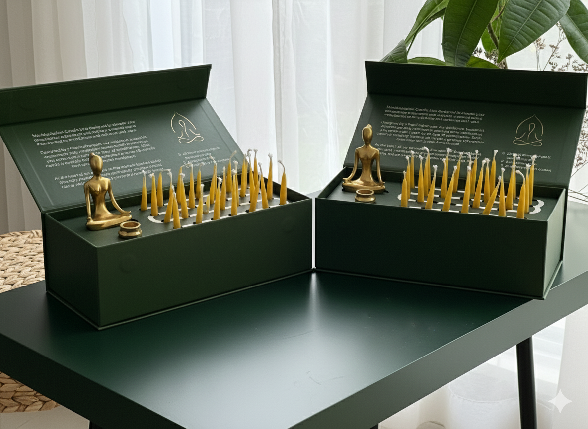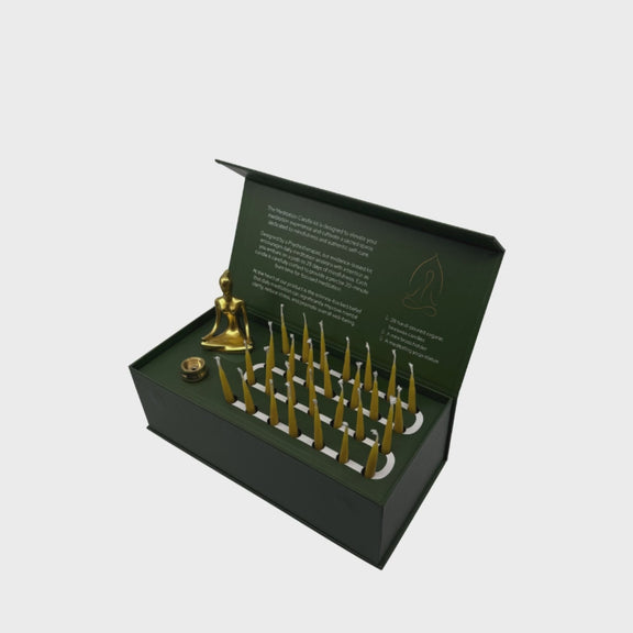 Each kit contains 28 organic beeswax candles, a mini brass holder, and meditating yoga figurine.